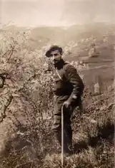 Capitaine Belmont posant pour la photo, dans la pente, sous l'actuelle route de Mittelbuhl - Buchteren, à 400 m à l'ouest de la ferme de Mittelbuhl (Soulzeren, Haut-Rhin)