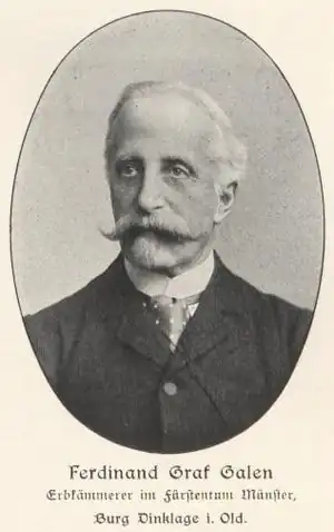 Ferdinand-Héribert von Galen. Il appartient par son père, le comte Johann Matthias von Galen (de) (1800-1880) à la famille von Galen, de vieille noblesse westphalienne et profondément catholique. Sa mère, née baronne Maria Anna von Ketteler (de) est issue d'une autre famille catholique célèbre. Il étudie à l'Académie de chevalerie rhénane à Bedburg, puis au lycée de Münster et étudie ensuite le droit à Munich, Louvain et Bonn. Il sert dans l'armée du royaume de Prusse de 1854 à 1858 en tant que lieutenant, puis s'occupe de ses biens de famille à Dinklage, près d'Oldenbourg. Il épouse en 1861 la comtesse Élisabeth von Spee qui lui donnera douze enfants, dont Wilhelm (1870-1949), en religion Augustinus, ob, et Clemens August (1878-1946), futur cardinal et bienheureux (2005).