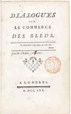 - Dialogues sur le commerce des bleds, Londres Paris, Merlin, (réimpr. Paris, Fayard, 1984, 978-2-213-01479-1), [4]-314-[1], in-8° (OCLC 829490384, lire en ligne sur Gallica).