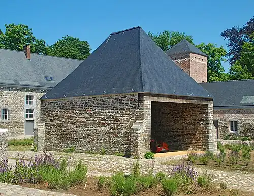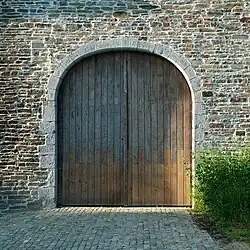 La grange est percée au nord d'un portail en pierre bleue dont les piédroits harpés portent un arc en forme d'anse de panier. Un portail similaire s'ouvre sur la cour mais son arc est réalisé en briques, avec une petite clé d'arc en pierre.