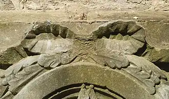 Au pied du mur pignon du logée, posée sur des blocs reposant à même le sol, se trouve une dalle armoriée portant un cartouche ovale à l'intérieur duquel est gravé un blason gravé d'une mitre flanquée de crosses en sautoir (symbole d'une double dignité) et portant la devise « Concordantia et Fervore »[3].