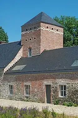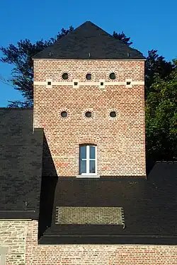 À l'est, le logis présente un pignon cantonné de chaînages d'angle en pierre bleue et percé de quatre niveaux de baies et de quelques trous de boulin.