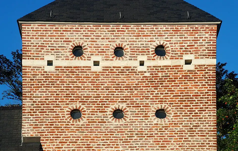 Le pigeonnier prend la forme d'une haute tour carrée en briques rouges coiffée d'une toiture pyramidale couverte d'ardoises. Au dernier niveau, il est percé de deux rangées d'oculi[Notes 1] séparées par un bandeau de pierre blanche reliant entre eux les trous de boulin.
