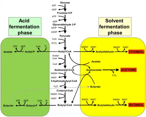 Le processus peut être assimilé à la façon dont la levure fermente les sucres pour produire de l'éthanol pour le vin, la bière ou le carburant, mais les organismes qui effectuent la fermentation ABE sont strictement anaérobies. La fermentation ABE produit des solvants dans un rapport de trois parties d'acétone, six parties de butanol pour une partie d'éthanol (3:6:1). Elle utilise généralement une souche de bactérie du genre Clostridia (famille des Clostridiaceae). Clostridium acetobutylicum (en) est l'espèce la plus étudiée et la plus utilisée, bien que Clostridium beijerinckii (en) ait également été utilisé avec de bons résultats[2].
