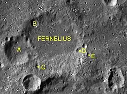 Par convention, les cratères satellites sont identifiés sur les cartes lunaires en plaçant la lettre sur le côté du point central du cratère qui est le plus proche de Fernelius.