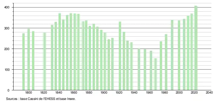 L'évolution du nombre d'habitants est connue à travers les recensements de la population effectués dans la commune depuis 1793. Pour les communes de moins de 10 000 habitants, une enquête de recensement portant sur toute la population est réalisée tous les cinq ans, les populations de référence des années intermédiaires étant quant à elles estimées par interpolation ou extrapolation[14]. Pour la commune, le premier recensement exhaustif entrant dans le cadre du nouveau dispositif a été réalisé en 2006[15].