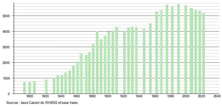 L'évolution du nombre d'habitants est connue à travers les recensements de la population effectués dans la commune depuis 1793. Pour les communes de moins de 10 000 habitants, une enquête de recensement portant sur toute la population est réalisée tous les cinq ans, les populations de référence des années intermédiaires étant quant à elles estimées par interpolation ou extrapolation[35]. Pour la commune, le premier recensement exhaustif entrant dans le cadre du nouveau dispositif a été réalisé en 2007[36].