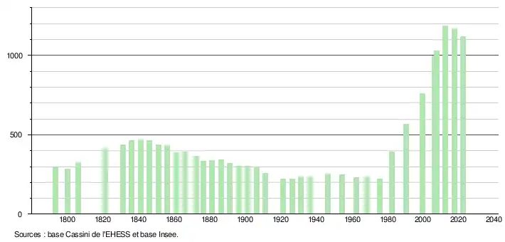 L'évolution du nombre d'habitants est connue à travers les recensements de la population effectués dans la commune depuis 1793. Pour les communes de moins de 10 000 habitants, une enquête de recensement portant sur toute la population est réalisée tous les cinq ans, les populations de référence des années intermédiaires étant quant à elles estimées par interpolation ou extrapolation[22]. Pour la commune, le premier recensement exhaustif entrant dans le cadre du nouveau dispositif a été réalisé en 2007[23].