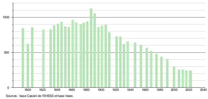 L'évolution du nombre d'habitants est connue à travers les recensements de la population effectués dans la commune depuis 1793. Pour les communes de moins de 10 000 habitants, une enquête de recensement portant sur toute la population est réalisée tous les cinq ans, les populations de référence des années intermédiaires étant quant à elles estimées par interpolation ou extrapolation[17]. Pour la commune, le premier recensement exhaustif entrant dans le cadre du nouveau dispositif a été réalisé en 2006[18].