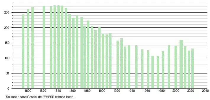 L'évolution du nombre d'habitants est connue à travers les recensements de la population effectués dans la commune depuis 1793. Pour les communes de moins de 10 000 habitants, une enquête de recensement portant sur toute la population est réalisée tous les cinq ans, les populations de référence des années intermédiaires étant quant à elles estimées par interpolation ou extrapolation[19]. Pour la commune, le premier recensement exhaustif entrant dans le cadre du nouveau dispositif a été réalisé en 2007[20].