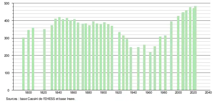 L'évolution du nombre d'habitants est connue à travers les recensements de la population effectués dans la commune depuis 1793. Pour les communes de moins de 10 000 habitants, une enquête de recensement portant sur toute la population est réalisée tous les cinq ans, les populations de référence des années intermédiaires étant quant à elles estimées par interpolation ou extrapolation[31]. Pour la commune, le premier recensement exhaustif entrant dans le cadre du nouveau dispositif a été réalisé en 2005[32].