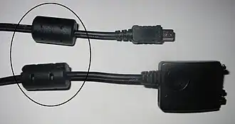 Le ferrite est une céramique ferrimagnétique[1] obtenue par moulage à forte pression et à haute température (>1 000 °C) d'un mélange d'oxyde de fer(III) et d'un autre oxyde métallique, de formule Fe2O3XO (où X est un élément chimique tel que le manganèse, le zinc, le le cobalt, le nickel, le plomb, le baryum, le strontium, etc.). Il est très utilisé en électronique et permet de mettre en œuvre des applications diverses et variées grâce à ses propriétés.