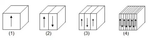 Les matériaux ferromagnétiques se divisent spontanément en domaines magnétiques car leur interaction d’échange est une force à courte portée, c’est pourquoi sur de longues portées la tendance des dipôles à réduire leur énergies en s’orientant en des directions opposées prend le dessus. Les domaines sont séparés par de fines parois de domaines, épaisses de quelques molécules dans lesquelles la direction d’aimantation du dipôle tourne doucement d’une direction de domaine à l’autre.