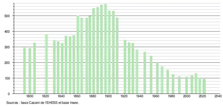 L'évolution du nombre d'habitants est connue à travers les recensements de la population effectués dans la commune depuis 1793. Pour les communes de moins de 10 000 habitants, une enquête de recensement portant sur toute la population est réalisée tous les cinq ans, les populations de référence des années intermédiaires étant quant à elles estimées par interpolation ou extrapolation[17]. Pour la commune, le premier recensement exhaustif entrant dans le cadre du nouveau dispositif a été réalisé en 2006[18].