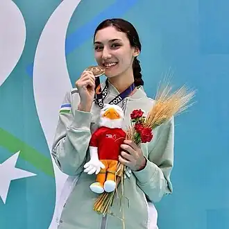 - ↑ « Феруза Садыкова — чемпионка Азии! Ещё 4 медали в копилке сборной Узбекистана по таэквондо », sur olympic.uz (consulté le )