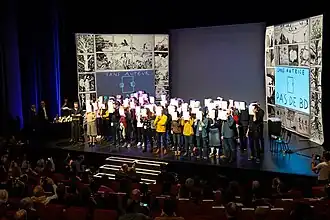 Marion Montaigne, Younn Locard, Florent Grouazel, Nicole Claveloux, Yoshiharu Tsuge, Emmanuel Guibert, Stéphane Beaujean, les auteurs et autrices sur la scène de la cérémonie des Fauves, Yoon-sun Park, des lectrices de Sacrées Sorcières de Pénélope Bagieu. | ||||||||