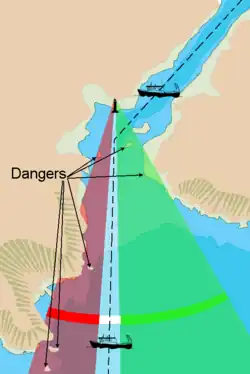Il arrive aussi qu'on utilise un feu à secteurs qui comporte alors un étroit secteur blanc éclairant le chenal "en eaux saines" ; on voit ce feu blanc devenir rouge si on s'écarte trop à gauche (en entrant dans le port), ou bien vert si on va trop à droite (toujours en entrant). Comme les feux de navigation dont le bateau est muni sont rouge à bâbord, vert à tribord, le timonier, pour corriger sa route, obliquera légèrement de manière à tourner son feu rouge vers le phare rouge ou son feu vert vers le phare vert ; puis, une fois le feu redevenu blanc, il fera à nouveau cap sur le phare.