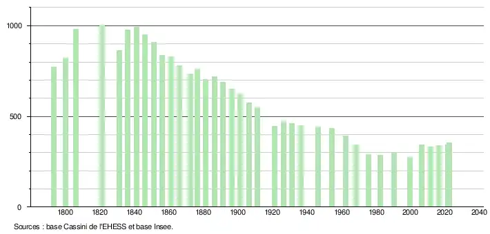 L'évolution du nombre d'habitants est connue à travers les recensements de la population effectués dans la commune depuis 1793. Pour les communes de moins de 10 000 habitants, une enquête de recensement portant sur toute la population est réalisée tous les cinq ans, les populations de référence des années intermédiaires étant quant à elles estimées par interpolation ou extrapolation[34]. Pour la commune, le premier recensement exhaustif entrant dans le cadre du nouveau dispositif a été réalisé en 2006[35].