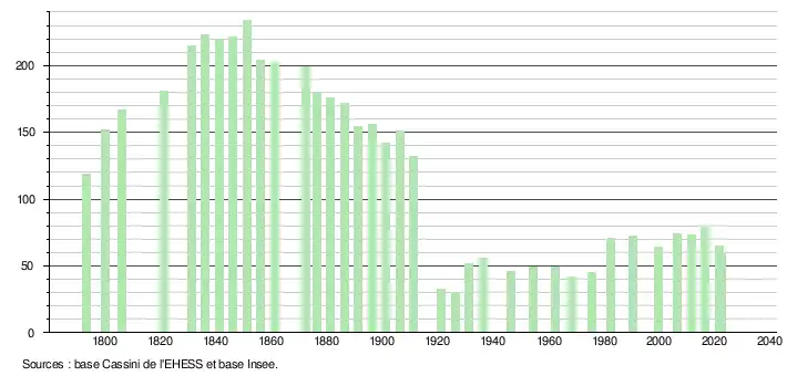 L'évolution du nombre d'habitants est connue à travers les recensements de la population effectués dans la commune depuis 1793. Pour les communes de moins de 10 000 habitants, une enquête de recensement portant sur toute la population est réalisée tous les cinq ans, les populations de référence des années intermédiaires étant quant à elles estimées par interpolation ou extrapolation[20]. Pour la commune, le premier recensement exhaustif entrant dans le cadre du nouveau dispositif a été réalisé en 2006[21].