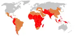 Zones d'endémie en 2000 (rouge : endémie forte, marron : endémie moyenne