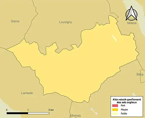 Le retrait-gonflement des sols argileux est susceptible d'engendrer des dommages importants aux bâtiments en cas d’alternance de périodes de sécheresse et de pluie[27]. 99,8 % de la superficie communale est en aléa moyen ou fort (59 % au niveau départemental et 48,5 % au niveau national)[Carte 3]. Depuis le , en application de la loi ELAN, différentes contraintes s'imposent aux vendeurs, maîtres d'ouvrages ou constructeurs de biens situés dans une zone classée en aléa moyen ou fort[Note 4],[28].