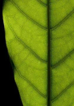 Les grandes feuilles alternes, ovales, lustrées, coriaces et à marge entière mesurent de 10 à 35 cm de long par 5 à 15 cm de large. La taille des feuilles est plus grande chez les jeunes plantes (jusqu'à 45 cm de long) mais beaucoup plus petite chez les arbres âgés (en moyenne 10 cm de long). Les feuilles se développent à l'intérieur d'un fourreau au méristème apical, qui grossit au fur et à mesure que la nouvelle feuille croît. Quand elle atteint son complet développement, elle se déploie et le fourreau tombe. À l'intérieur de la nouvelle feuille, une autre feuille immature est en attente de développement.