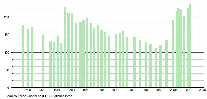 L'évolution du nombre d'habitants est connue à travers les recensements de la population effectués dans la commune depuis 1793. Pour les communes de moins de 10 000 habitants, une enquête de recensement portant sur toute la population est réalisée tous les cinq ans, les populations de référence des années intermédiaires étant quant à elles estimées par interpolation ou extrapolation[29]. Pour la commune, le premier recensement exhaustif entrant dans le cadre du nouveau dispositif a été réalisé en 2004[30].