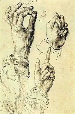 - En Italie, ce signe, connu sous le nom de mano in fico (« main dans la figue »), ou far le fiche (geste de la chatte), pour la ressemblance avec les organes génitaux féminins, était un geste courant et très grossier au cours des siècles passés, semblable au doigt d'honneur, mais est depuis longtemps tombé en désuétude[1]. Notamment, une trace de son utilisation se trouve dans la Divine Comédie de Dante (Inferno, Canto XXV[4]), et il est couramment représenté dans les peintures médiévales de l'Homme de douleurs[réf. nécessaire]. Le geste est plusieurs fois représenté dans les peintures de la Renaissance tardive et du baroque, comme l'a montré l'exposition « Les bas-fonds du Baroque » (Rome et Paris) : chez Bruegel, Simon Vouet, Godfried Schalcken, etc[5].