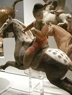 On connait des groupes de danseuses ou de petits orchestres de musiciennes assises, et certaines statuettes assises semblant soigner leur apparence. Plus rarement, il y a aussi des cavalières et des joueuses de polo, vêtues de vêtements masculins, ce qui était habituel pour les femmes Tang à cheval, mais apparemment une mode dans la capitale à d'autres occasions[43]. La période a été marquée par une liberté inhabituelle pour les femmes aisées en Chine, et les statuettes en témoignent[44].