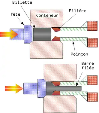 La billette (cylindre plein de métal) de métal préalablement chauffée est placée dans le conteneur. Un poinçon exerce une poussée. Le métal est d'abord plaqué contre la filière et file à travers elle en prenant sa forme définitive[3].