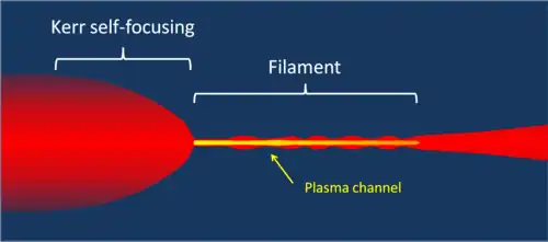 En optique non linéaire, la filamentation laser est la propagation d'un faisceau laser dans un milieu transparent sans diffraction. Elle est rendue possible par l'effet Kerr optique qui génère une modification de l'indice de réfraction du milieu en présence d'un champ laser intense, résultant en l'auto-focalisation du faisceau[1],[2],[3]. Typiquement, ce régime est obtenu en propageant une impulsion lumineuse délivrée par un laser femtoseconde amplifié.