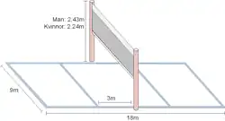 | beach-volley[3] et snow-volley[4] | 2,00 ou 2,10 ou 2,24 ou 2,43m | 8 - 8,50m | 1m | 10cm | 7 - 10cm | 7 - 10cm |