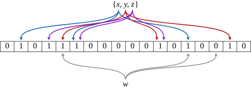 Un filtre de Bloom est constitué d'un tableau de bits de taille m, ainsi qu'une collection de k fonctions de hachage . Chaque fonction de hachage associe tout élément à une case du tableau[1]. En général, k est une constante qui dépend du taux de faux positifs souhaité, tandis que m est proportionnel à k et au nombre d'éléments à ajouter.
