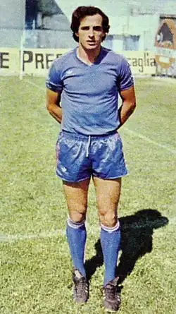 Willy van der Kuijlen (PSV) portant un maillot bastiais et célébrant avec le trophée de la Coupe UEFA après le match retour à Eindhoven. | ||||||||