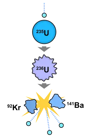 Exemple d'une fission nucléaire de l'uranium 235. Il absorbe un neutron (représenté par le point bleu ciel en haut). Il devient uranium 236, puis se scinde en 92Kr et 141Ba et produit 3 neutrons (trois points bleu ciel en bas).