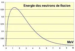 Probabilité en énergie (i. e. vitesse) des neutrons issus des fissions de l'uranium 235. L'essentiel des neutrons émis ont une énergie comprise entre 0,25 et 4 MeV ; il n'y a guère de neutrons ayant une énergie supérieure à 6 MeV.