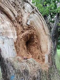 La cavité créée se remplit progressivement de bois en décomposition, d'hyphes fongiques et d'autres substances organiques, ce qui constitue un dendromicrohabitat propice au développement de nombreuses espèces saproxyliques, surtout des Coléoptères comme Triphyllus bicolor, le Mycétophage bicolor[28]. Ce genre d'habitat est considéré comme un point chaud de biodiversité[29]. Néanmoins, les tanins constituent une protection de l'arbre contre les parasites. Une fois dégradés par la Fistuline hépatique, la colonisation du bois est facilitée pour d'autres xylophages, qui affaiblissent à leur tour l'arbre. C'est le cas par exemple de la Grosse vrillette, dont les larves colonisent les Chênes à la suite de la Fistuline hépatique et d'autres champignons xylophages tels que le Polypore soufré. Dans cette interaction, l'insecte est favorisé par le ramollissement du bois, la baisse du taux de tanins et une amélioration de sa nutrition alors que le mycélium peut bénéficier de l'apport de nutriments grâce aux fèces de l'animal[30],[31].