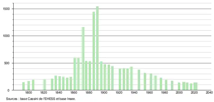 L'évolution du nombre d'habitants est connue à travers les recensements de la population effectués dans la commune depuis 1793. Pour les communes de moins de 10 000 habitants, une enquête de recensement portant sur toute la population est réalisée tous les cinq ans, les populations de référence des années intermédiaires étant quant à elles estimées par interpolation ou extrapolation[20]. Pour la commune, le premier recensement exhaustif entrant dans le cadre du nouveau dispositif a été réalisé en 2005[21].