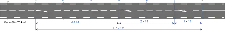 Dans le cas d'une autoroute, pour augmenter la facilité d'insertion, la longueur du biseau de rabattement est portée à 2 L. On adopte alors la configuration suivante pour obtenir une meilleure répartition des flèches :