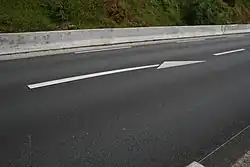 Sur les routes à trois, quatre voies ou sur autoroute, les flèches de rabattement sont implantées suivant l'axe de la voie qui est supprimée : la voie supprimée est alors, sauf cas exceptionnel, la voie la plus à gauche dans le sens de circulation considéré.