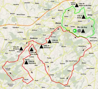Le parcours effectue une boucle au sud de Huy puis une petite boucle au nord. Il comporte neuf côtes [1],[2]: