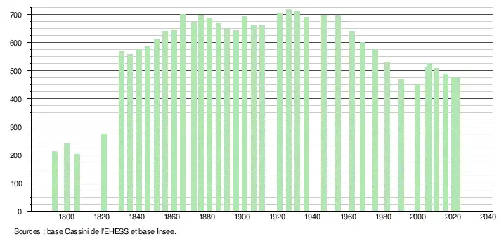 L'évolution du nombre d'habitants est connue à travers les recensements de la population effectués dans la commune depuis 1793. Pour les communes de moins de 10 000 habitants, une enquête de recensement portant sur toute la population est réalisée tous les cinq ans, les populations de référence des années intermédiaires étant quant à elles estimées par interpolation ou extrapolation[40]. Pour la commune, le premier recensement exhaustif entrant dans le cadre du nouveau dispositif a été réalisé en 2005[41].
