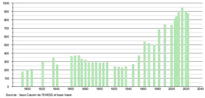 L'évolution du nombre d'habitants est connue à travers les recensements de la population effectués dans la commune depuis 1793. Pour les communes de moins de 10 000 habitants, une enquête de recensement portant sur toute la population est réalisée tous les cinq ans, les populations de référence des années intermédiaires étant quant à elles estimées par interpolation ou extrapolation[19]. Pour la commune, le premier recensement exhaustif entrant dans le cadre du nouveau dispositif a été réalisé en 2004[20].