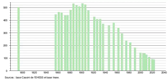 L'évolution du nombre d'habitants est connue à travers les recensements de la population effectués dans la commune depuis 1793. Pour les communes de moins de 10 000 habitants, une enquête de recensement portant sur toute la population est réalisée tous les cinq ans, les populations de référence des années intermédiaires étant quant à elles estimées par interpolation ou extrapolation[18]. Pour la commune, le premier recensement exhaustif entrant dans le cadre du nouveau dispositif a été réalisé en 2004[19].