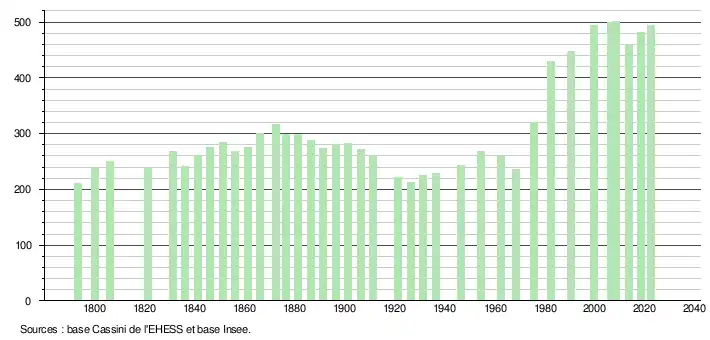 L'évolution du nombre d'habitants est connue à travers les recensements de la population effectués dans la commune depuis 1793. Pour les communes de moins de 10 000 habitants, une enquête de recensement portant sur toute la population est réalisée tous les cinq ans, les populations de référence des années intermédiaires étant quant à elles estimées par interpolation ou extrapolation[13]. Pour la commune, le premier recensement exhaustif entrant dans le cadre du nouveau dispositif a été réalisé en 2008[14].