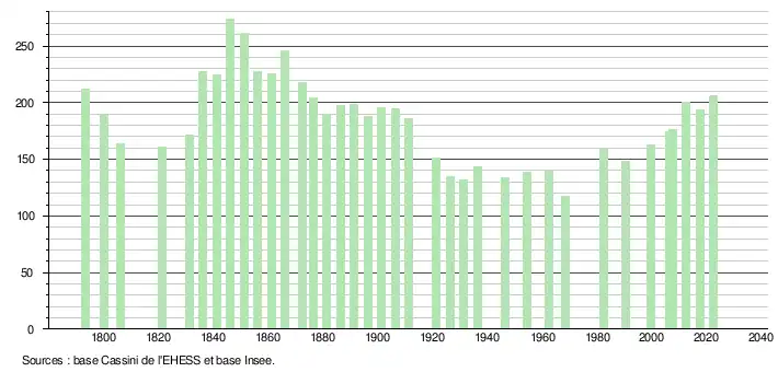 L'évolution du nombre d'habitants est connue à travers les recensements de la population effectués dans la commune depuis 1793. Pour les communes de moins de 10 000 habitants, une enquête de recensement portant sur toute la population est réalisée tous les cinq ans, les populations de référence des années intermédiaires étant quant à elles estimées par interpolation ou extrapolation[19]. Pour la commune, le premier recensement exhaustif entrant dans le cadre du nouveau dispositif a été réalisé en 2007[20].