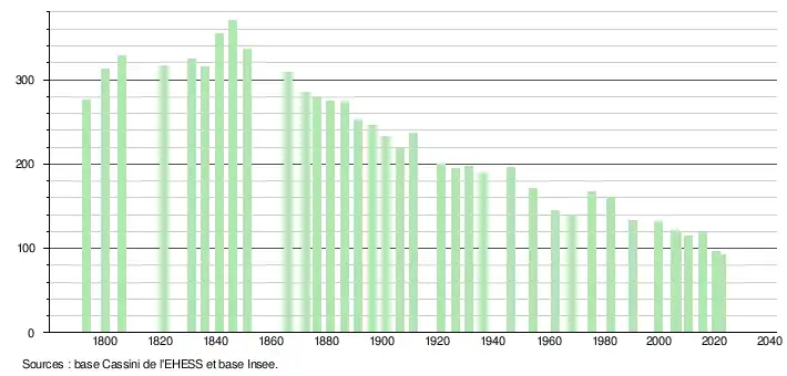 L'évolution du nombre d'habitants est connue à travers les recensements de la population effectués dans la commune depuis 1793. Pour les communes de moins de 10 000 habitants, une enquête de recensement portant sur toute la population est réalisée tous les cinq ans, les populations de référence des années intermédiaires étant quant à elles estimées par interpolation ou extrapolation[27]. Pour la commune, le premier recensement exhaustif entrant dans le cadre du nouveau dispositif a été réalisé en 2005[28].