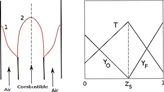 Dans la limite de Burke–Schumann la flamme est considérée comme une fine couche de réaction en dehors de laquelle le combustible et l'oxygène ne peuvent pas coexister : presque partout. La couche de réaction elle-même est constituée par la surface stœchiométrique , soit :