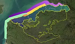 D'il y a 17 000 à 10 000 ans, la Flandre a subi une transgression appelée "transgression flandrienne" ; c'est-à-dire un déplacement de la ligne de rivage vers l'intérieur des terres ; l'eau des inlandsis a fondu, ce qui a entrainé une remontée du niveau de la Manche d'environ 100 m sur le long des côtes des Pays-Bas et des Flandres belge et française[36].