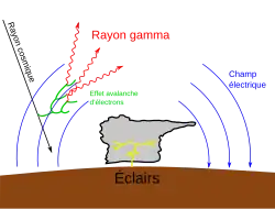 Les flashs de rayons gamma terrestres sont probablement causés par une émission Bremsstrahlung produite par une avalanche d'électrons runaways relativites (en) accélérés par des champs électriques intenses produits au-dessus ou à l'intérieur de certains orages[1].